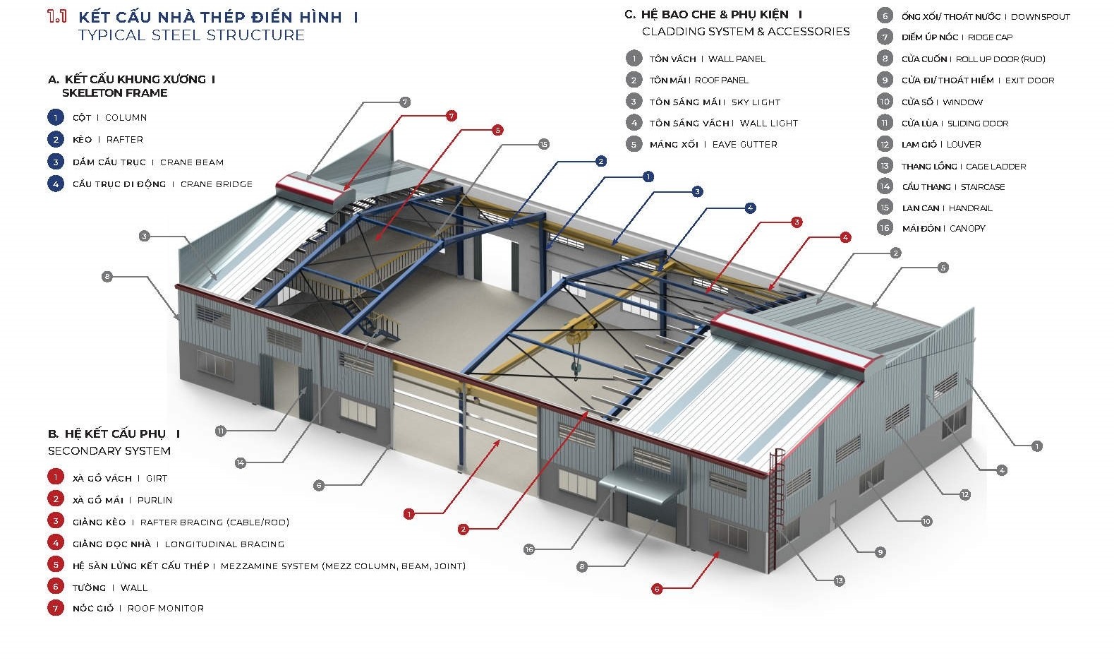 Components of pre-engineered steel buildings include foundations, types of steel trusses for buildings with different functions, cover systems, floors & cranes.